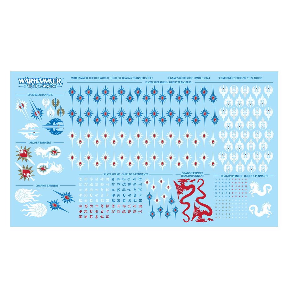 This kit comprises 98 plastic components, 2x Citadel 50mm by 100mm Rectangular Bases, and 1x High Elf Realms Transfer sheet containing 356 high-quality waterslide transfers to decorate your miniatures.
